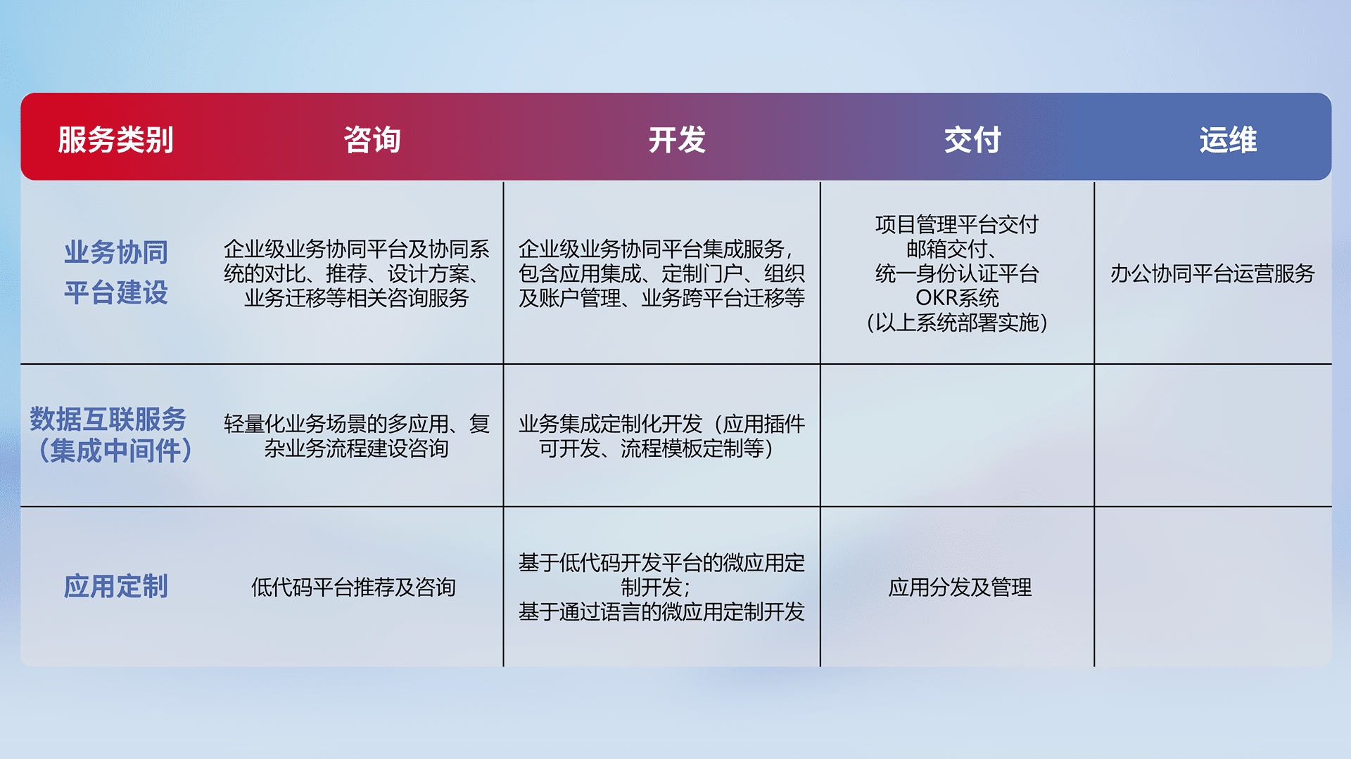 针对钉钉、、企微、、、IDaas等平台级产品提供产品的规划、、、、方案、、、、交付、、、定制化开发等服务,,,实现如统一协同办公、、、智能客户服务、、、混合会议管理、、、智能数据查询、、、、等业务场景,,,实现数字化转型。。。